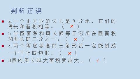 b.半圆面积和周长都等于它所在圆面积和周长的二分之一。( )