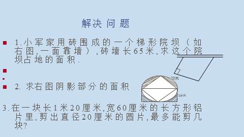 1.小军家用砖围成的一个梯形院坝(如右图,一面靠墙),砖墙长65米,求这个院坝占地的面积.