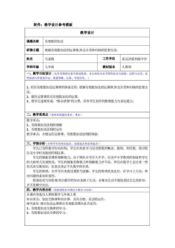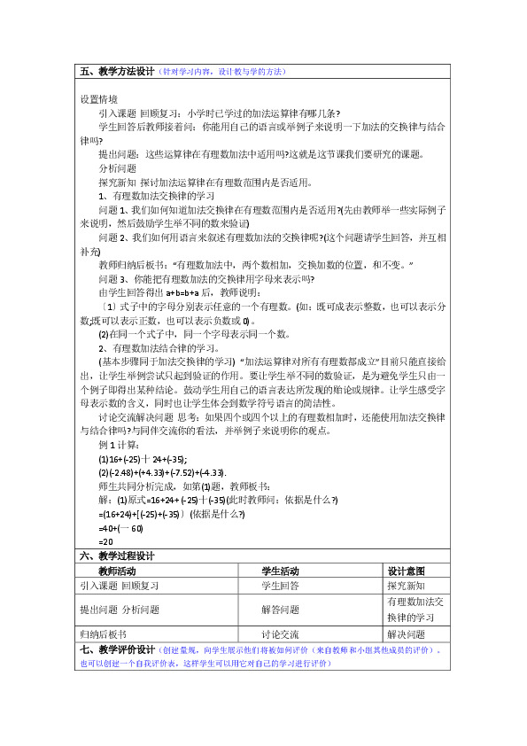 (基本步骤同于加法交换律的学习) “加法运算律对所有有理数都成立”目前只能直接给出,让学生举例尝试只起到验证的作用。要让学生举不同的数验证,是为避免学生只由一个例子即得出某种结论。鼓动学生用自己的语言表达所发现的贻论或规律。让学生感受字母表示数的含义,同时也让学生体会到数学符号语言的简洁性。