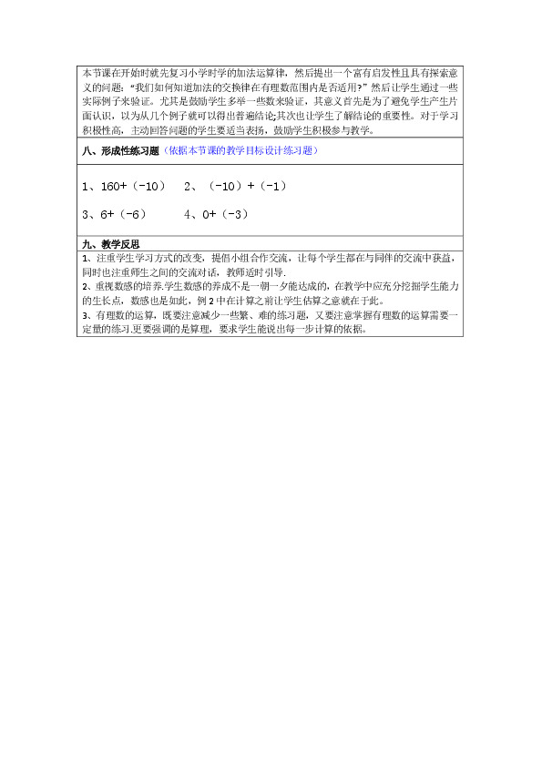 本节课在开始时就先复习小学时学的加法运算律,然后提出一个富有启发性且具有探索意义的问题:“我们如何知道加法的交换律在有理数范围内是否适用?”然后让学生通过一些实际例子来验证。尤其是鼓励学生多举一些数来验证,其意义首先是为了避免学生产生片面认识,以为从几个例子就可以得出普遍结论;其次也让学生了解结论的重要性。对于学习积极性高,主动回答问题的学生要适当表扬,鼓励学生积极参与教学。