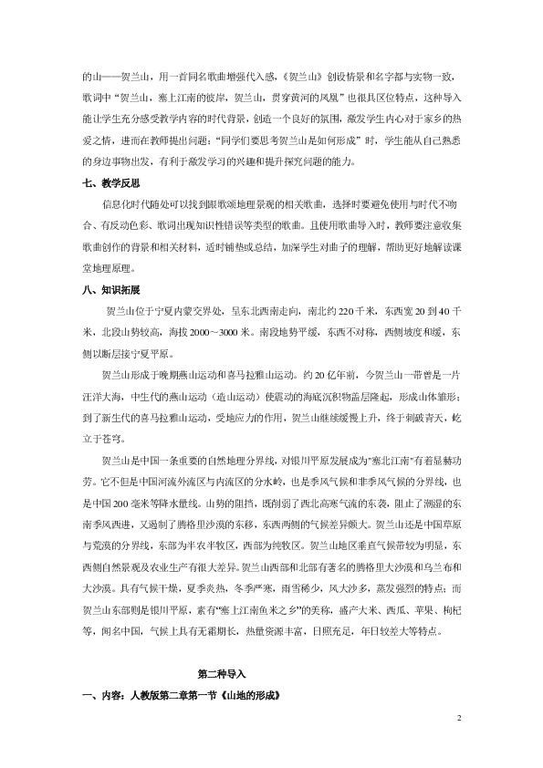 良好的导入是一节课是否有效的第一步,音乐以其特有的节奏、旋律成为学生们喜欢的一种娱乐方式。本节课学习《山地的形成》侧重山地形成的原因,而在座师生的家乡有座最有名的山——贺某某,用一首同名歌曲增强代入感,《贺某某》创设情景和名字都与实物一致,歌词中“贺某某,塞上江南的彼岸,贺某某,贯穿黄河的凤凰”也很具区位特点,这种导入能让学生充分感受教学内容的时代背景,创造一个良好的氛围,激发学生内心对于家乡的热爱之情,进而在教师提出问题:“同学们要思考贺某某是如何形成”时,学生能从自己熟悉的身边事物出发,有利于激发学习的兴趣和提升探究问题的能力。