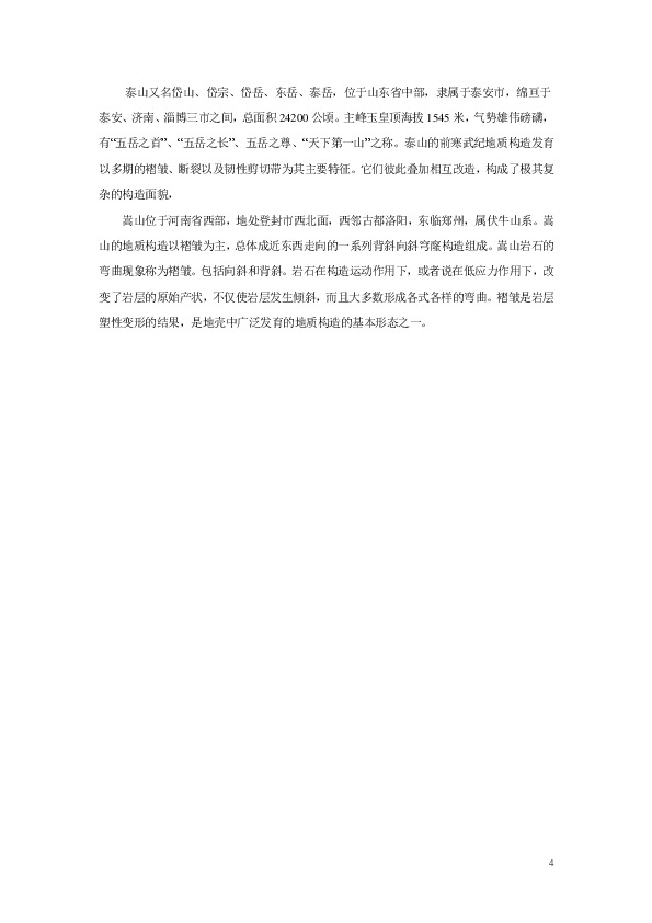 【师】我国是个多山的国家, 内容过长,仅展示头部和尾部部分文字预览,全文请查看图片预览。 主峰玉皇顶海拔1545米,气势雄伟磅礴,有“五岳之首”、“五岳之长”、五岳之尊、“天下第一山”之称。泰山的前寒武纪地质构造发育以多期的褶皱、断裂以及韧性剪切带为其主要特征。它们彼此叠加相互改造,构成了极其复杂的构造面貌,
