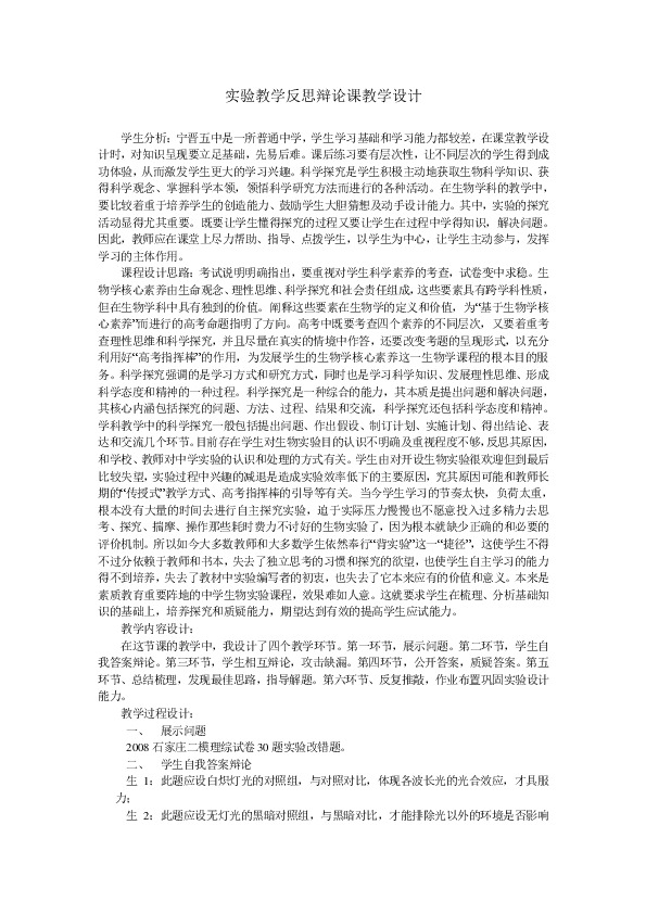 以下为《实验设计反思辩论课教学设计》的无排版文字预览,完整格式请下载