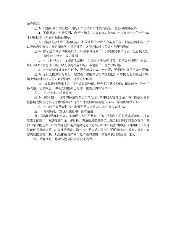 生9:请问老师,这样的答案能保证饥饿处理叶片中的淀粉都耗完了吗?能毫无事实根据地说实验材料无个体差异吗?这些个体差异影响淀粉形成吗?影响实验结果吗?