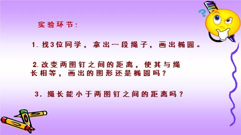 1.找3位同学,拿出一段绳子,画出椭圆。