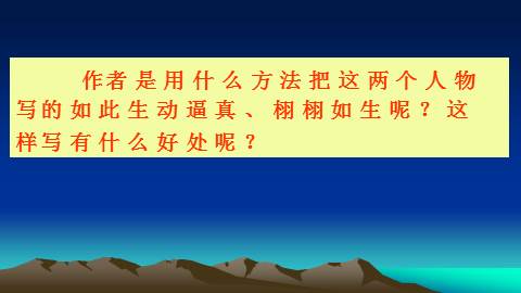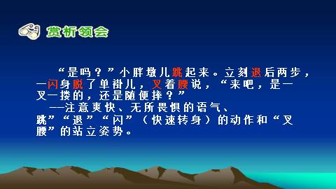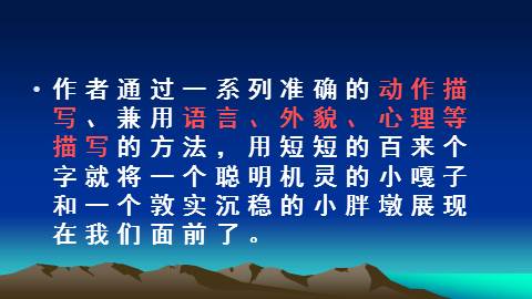 作者是用什么方法把这两个人物写的如此生动逼真、栩栩如生呢?这样写有什么好处呢? 作者通过一系列准确的动作描写、兼用语言、外貌、心理等描写的方法,用短短的百来个字就将一个聪明机灵的小嘎子和一个敦实沉稳的小胖墩展现在我们面前了。小练笔: 发挥想象,运用动作描写的方法,写出第二次摔跤的情景: