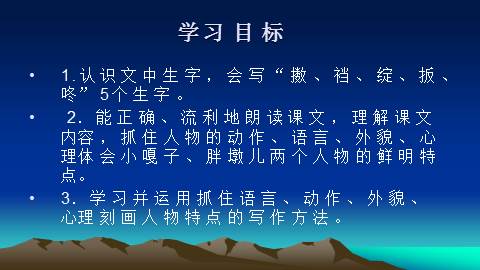 2.能正确、流利地朗读课文,理解课文内容,抓住人物的动作、语言、外貌、心理体会小嘎子、胖墩儿两个人物的鲜明特点。