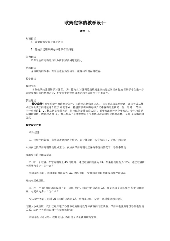 以下为《欧姆定律的教学设计》的无排版文字预览,完整格式请下载