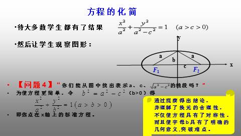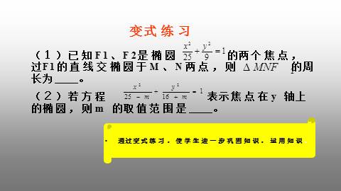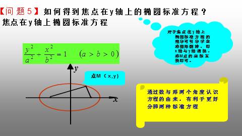 对于焦点在y轴上椭圆标准方程的推导可引导学生将图形翻转,即x轴与y轴调换,将M点的坐标互换即可。