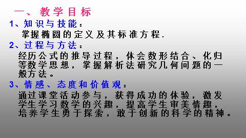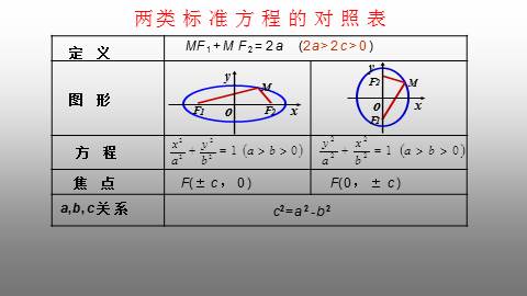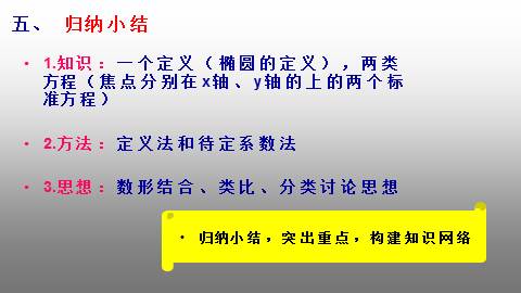 1.知识:一个定义(椭圆的定义),两类方程(焦点分别在x轴、y轴的上的两个标准方程)