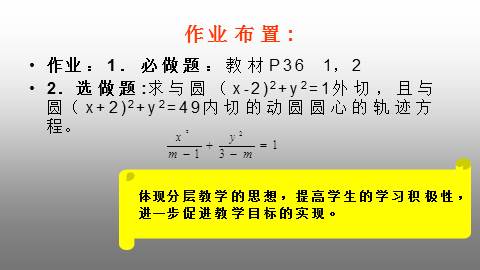 2.选做题:求与圆(x-2)2+y2=1外切,且与圆(x+2)2+y2=49内切的动圆圆心的轨迹方程。