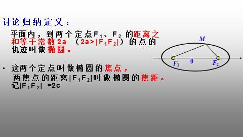 平面内,到两个定点F1、F2 的距离之和等于常数2a (2a>|F1F2|)的点的轨迹叫做椭圆。