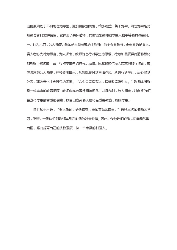 陶行知先生说:“要人敬的,必先自敬,重师首先师自重。”通过本次师德师风学习,使我进一步认识到教师本身在时代的社会价值。因此,作为教师的我,应懂得自尊、自重,努力提高自己的从教素质,做一个幸福的引路人。