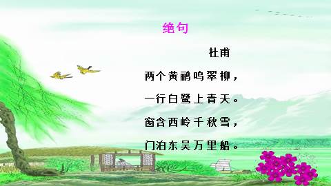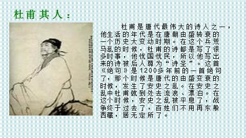 杜甫是唐代最伟大的诗人之一,他生活的年代是在唐朝由盛转衰的一个历史大变动时期。在这个兵荒马乱的时候,杜甫的诗都是写了很多时事,他忧国忧民,所以他写出来的诗被后人尊为“诗圣”。这首《绝句》是1200多年前的一首绝句了,那个时候是唐代的由盛变衰的时候,发生了安史之乱。在安史之乱中杜甫就到处去流浪、漂泊。在这个时候,安史之乱被平息了,战争终于过去了,百姓们不用再东躲西藏,居无定所了。杜甫其人: 绝句