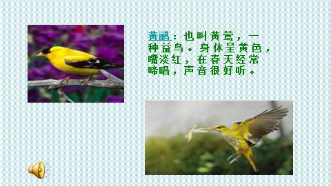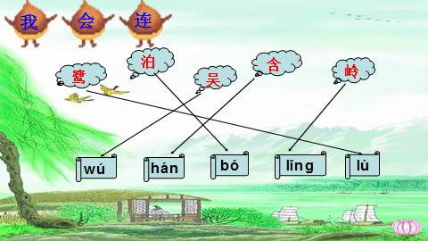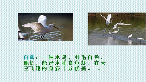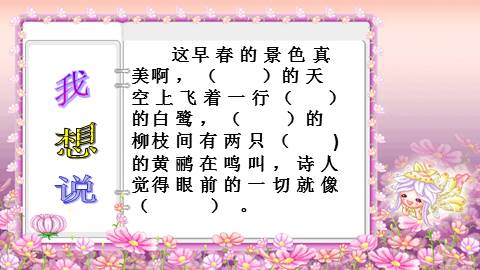 2、有不理解的可以寻求同伴的帮助。老师的提示:可以根据插图理解,也可以借助工具书理解,在书上标一标,记一记。 这早春的景色真美啊,( )的天空上飞着一行( )的白鹭,( )的柳枝间有两只( )的黄鹂在鸣叫,诗人觉得眼前的一切就像( ) 。我想说黄鹂:也叫黄莺,一种益鸟。身体呈黄色,嘴淡红,在春天经常啼唱,声音很好听。白鹭:一种水鸟,羽毛白色,腿长,能涉水捕食鱼虾,在天空飞翔的身姿十分优美。 。