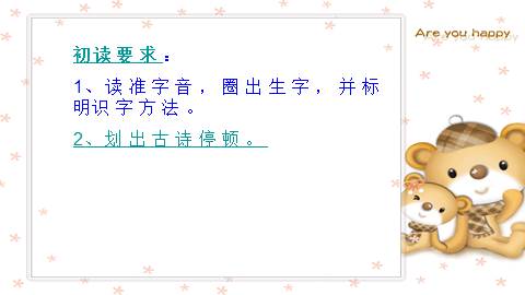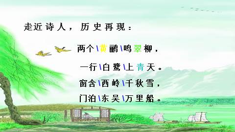 1、读准字音,圈出生字,并标明识字方法。2、划出古诗停顿。走近诗人,历史再现:两个\黄鹂\鸣翠柳,