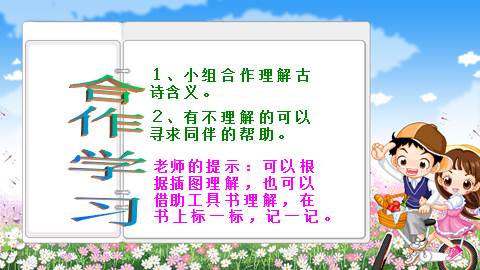 窗含\西岭\千秋雪,门泊\东吴\万某某。合作学习1、小组合作理解古诗含义。
