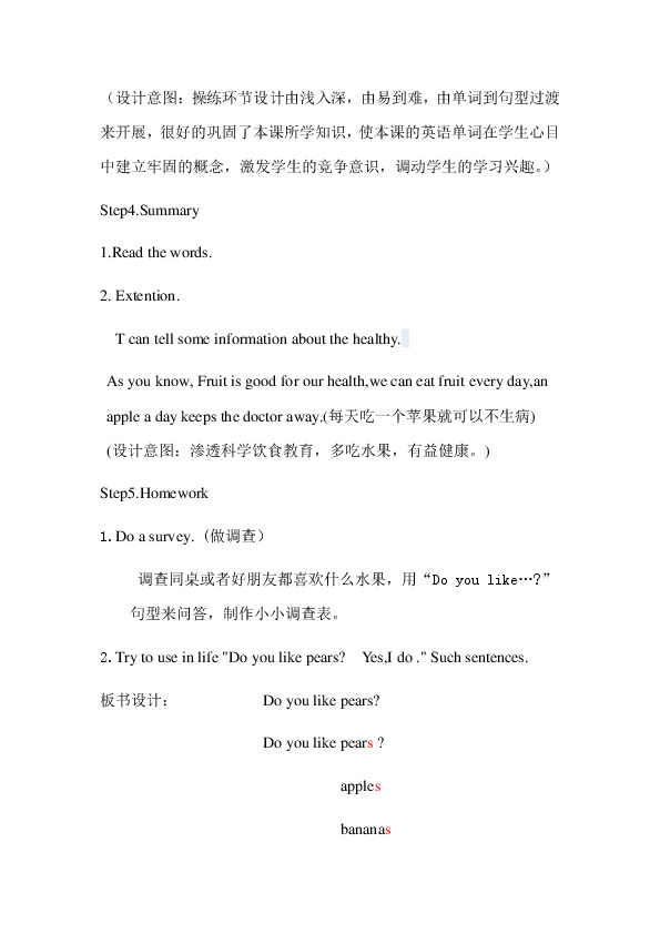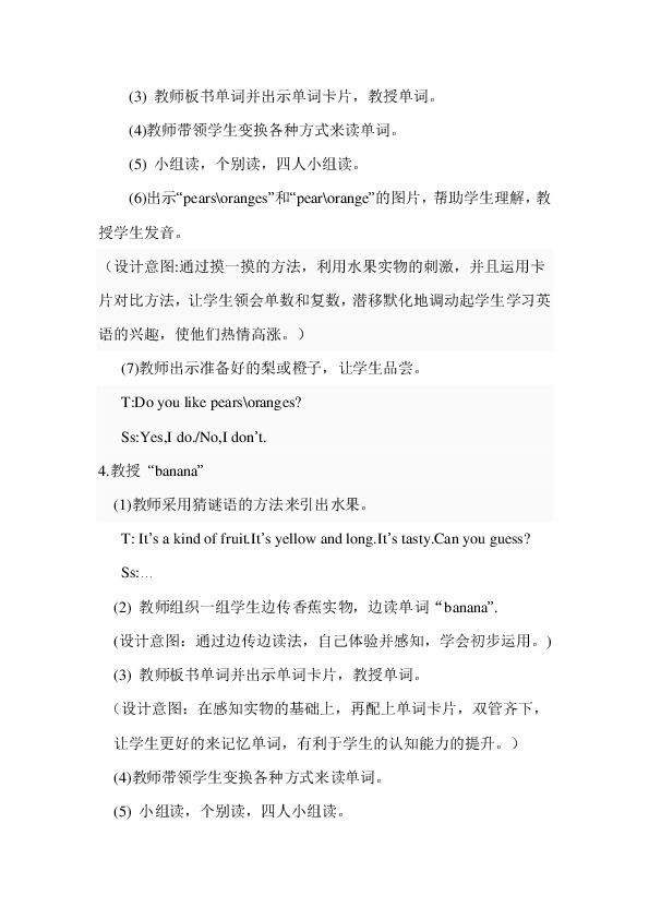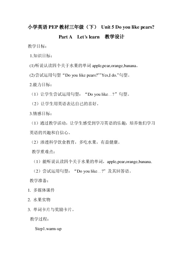 (1)能听说认读四个关于水果的单词,apple,pear,orange,banana.(2)尝试运用句型:“Do you likeXXXXX?” 及其回答语。