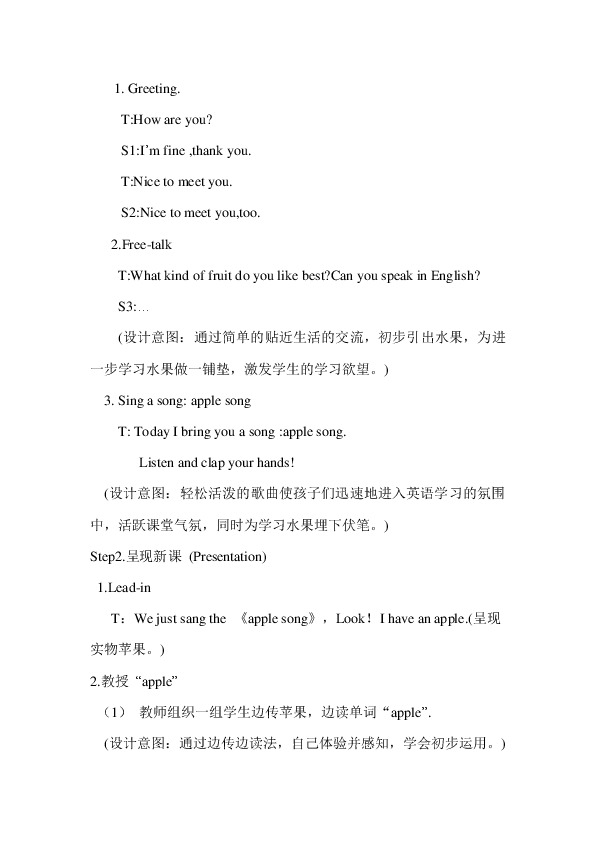 T:We just sang the 《apple song》,Look!I have an apple.(呈现实物苹果。)