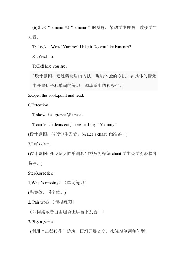 (6)出示“banana”和“bananas”的图片,帮助学生理解,教授学生发音。