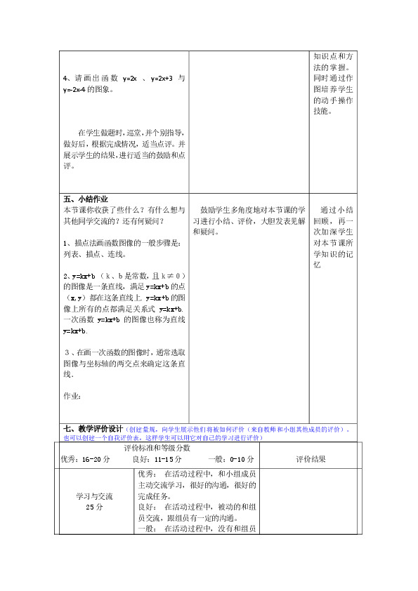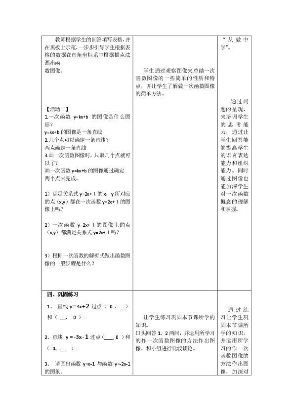 通过练习回顾了关于一次函数计算的知识,让学生积极的参与到画函数图像中来。让学生“从做中学”。