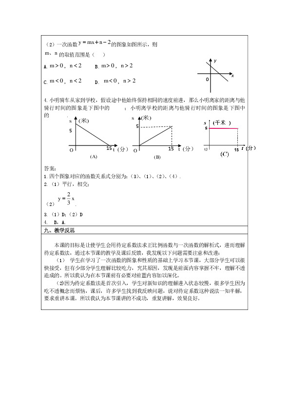 (1) 学生在学习了一次函数的图象和性质的基础上学习本节课,大部分学生可以很快接受,但有少部分学生理解比较吃力,究其原因,发现是前面内容掌握不牢,理解不透造成的。所以我认为在本节课前有必要对前置内容加以深化。