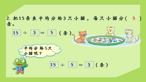 2. 把15条鱼平均分给3只小猫,每只小猫分( )条。