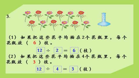 (1)如果把这些花平均插在2个花瓶里,每个花瓶放( )枝。