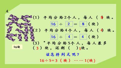 (3)*平均分给5个人,每人最多( )块,还剩( )块。
