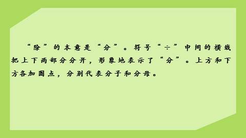 “除”的本意是“分”。符号“XXXXX”中间的横线把上下两部分分开,形象地表示了“分”。上方和下方各加圆点,分别代表分子和分母。