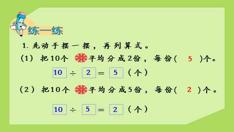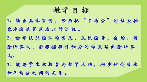 2、初步认识除法的意义,认识除号,会读、写除法算式,会根据操作和分的结果写出除法算式。