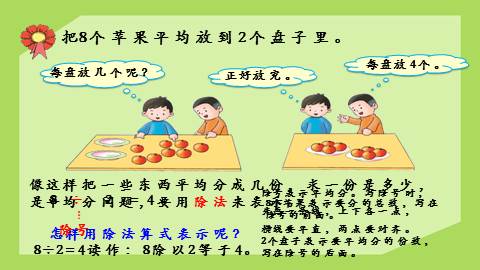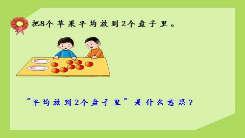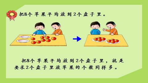 把8个苹果平均放到2个盘子里,就是要求2个盘子里放苹果的个数同样多。