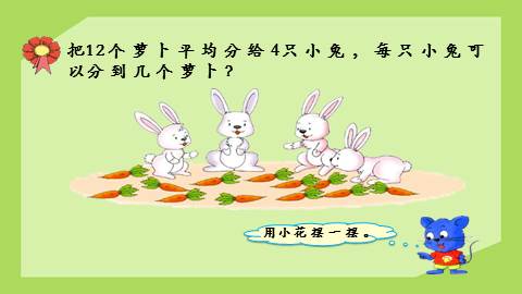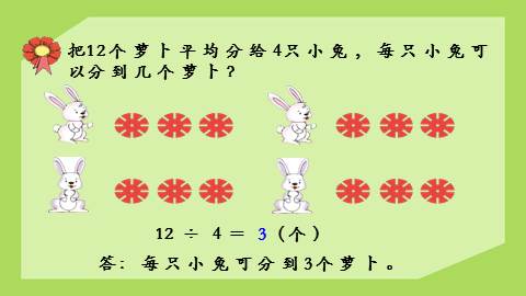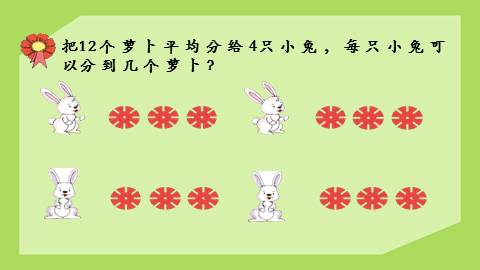 把12个萝卜平均分给4只小兔,每只小兔可以分到几个萝卜?