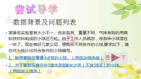 2、方正要购买直径在5毫米到8毫米之间(不含5和8)的小球。(用自定义筛选)