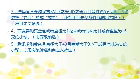 3、清华同方要购买直径在3毫米到5毫米并且是红色的小球。(如果把“并且”换成“或者”,还能用自定义条件筛选出来吗?) (用自定义筛选)