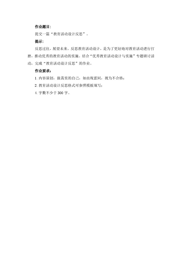 反思过往,展望未来。反思教育活动设计,是为了更好地对教育活动进行打磨,推动优秀的教育活动的实施。结合“优秀教育活动设计与实施”专题研讨活动,完成“教育活动设计反思”的作业。