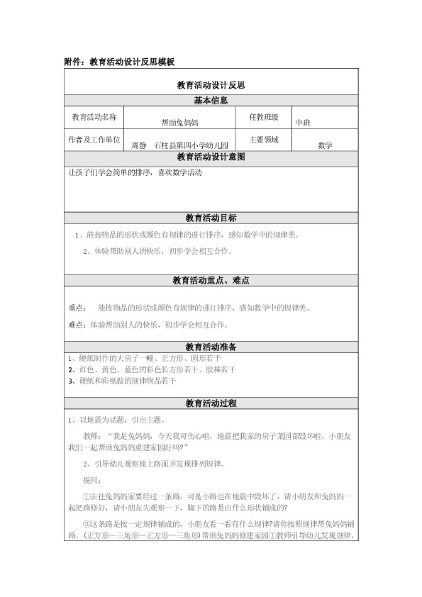 ②这条路是按一定规律铺成的,小朋友看一看有什么规律?请你按照规律帮兔妈妈铺路。(正方形—三角形—正方形—三角形)帮助兔妈妈修建家园①教师引导幼儿发现规律,请小朋友按照规律操作。