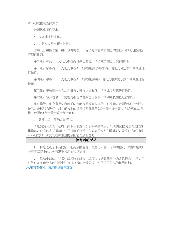 1、 情景创设了小兔的家,但是家的感觉、氛围还不够,家中的摆设、衣服的摆放与真实家庭中的具体情况更接近的话则更好。