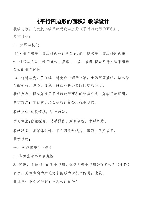 以下为《《平行四边形的面积》教学设计》的无排版文字预览,完整格式请下载