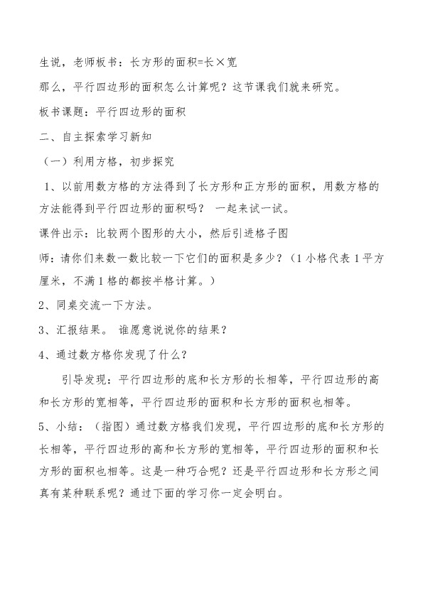 5、小结:(指图)通过数方格我们发现,平行四边形的底和长方形的长相等,平行四边形的高和长方形的宽相等,平行四边形的面积和长方形的面积也相等。这是一种巧合呢?还是平行四边形和长方形之间真有某种联系呢?通过下面的学习你一定会明白。