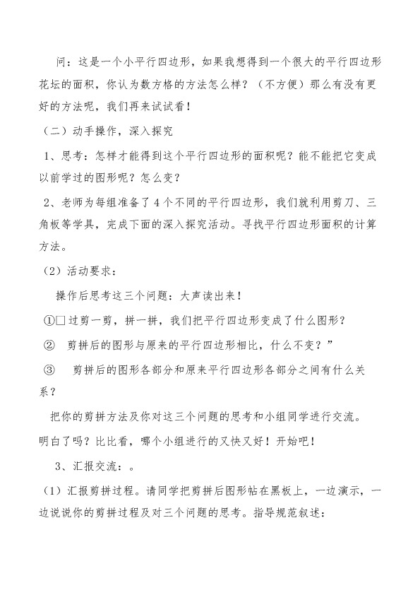 (2)汇报深入探究的三个问题。结合剪拼过程,谁来这儿边指图形边说说你对这三个问题的思考? (①通过剪一剪,拼一拼,我们把平行四边形变成了长方形。②剪拼后的长方形与原来的平行四边形相比,面积不变。③剪拼后的长方形的长和原来平行四边形的底相等,长方形的宽和平行四边形的高相等。)