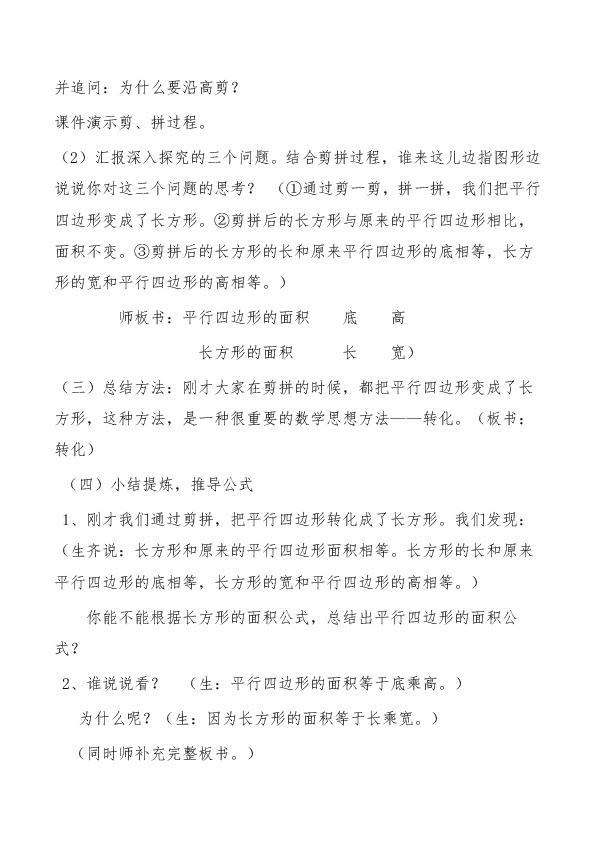 (三)总结方法:刚才大家在剪拼的时候,都把平行四边形变成了长方形,这种方法,是一种很重要的数学思想方法——转化。(板书:转化)