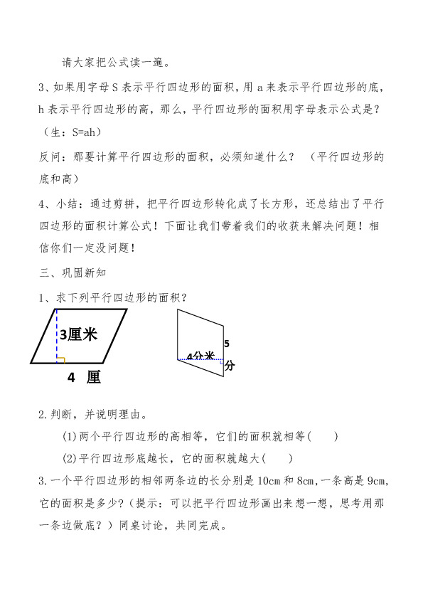 3、如果用字母S表示平行四边形的面积,用a来表示平行四边形的底,h表示平行四边形的高,那么,平行四边形的面积用字母表示公式是? (生:S=ah)