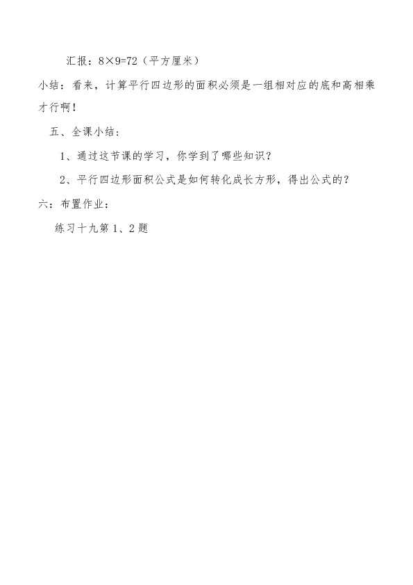 (1)推导出平行四边形面积计算公式,能正确求平行四边形的面积。
