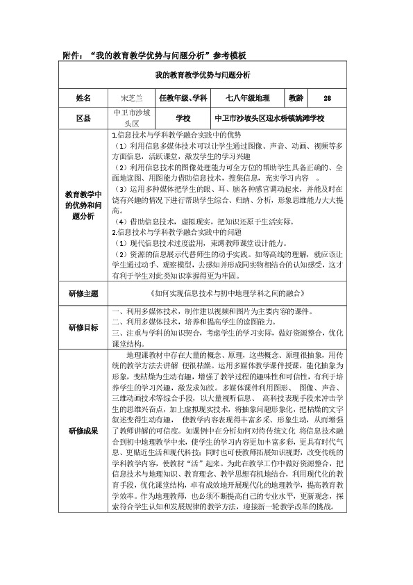 地理课教材中存在大量的概念、原理,这些概念、原理很抽象,用传统的教学方法去讲解 便很枯燥。运用多媒体教学课件授课,能化抽象为形象,变枯燥为生动有趣,增强了教学过程的趣味性和可信性,有利于培养学生的学习兴趣,激发求知欲。多媒体课件利用图形、 图像、声音、三维动画技术等综合手段,以大量视听信息、 高科技表现手段来冲击学生的思维兴奋点,加上虚拟现实技术,将抽象问题形象化,把枯燥的文字叙述变得生动有趣, 使教学内容表现得丰富多采、形象生动,从而增强了教师讲解的可信度。如课例中在分析如何对待传统文化 将信息技术融合到初中地理教学中来,使学生的学习内容更加丰富多彩,更具有时代气息、更贴近生活和现代科技;同时也可使教师拓展知识视野,改变传统的学科教学内容,使教材“活”起来。为此在教学工作中做好资源整合,把信息技术与地理知识、教育理念、教学思想有机地结合,利用现代化的教育手段,优化课堂结构,卓有成效地开展现代化的地理教学,提高教育教学效率。作为地理教师,也必须不断提高自己的专业水平,更新观念,探索符合学生认知和发展规律的教学方法,迎接新一轮教学改革的挑战。
