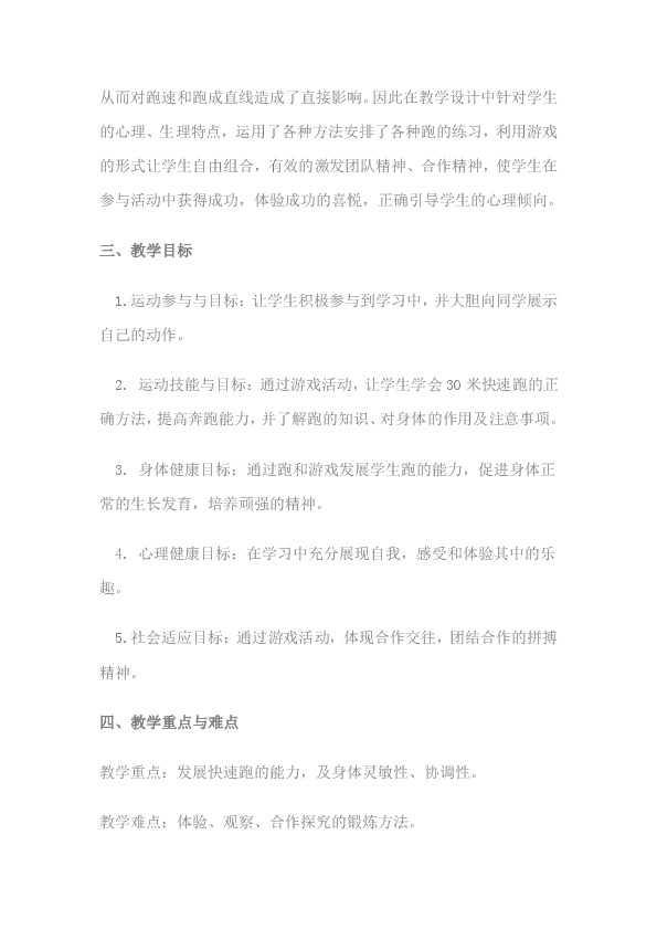 ?2. 运动技能与目标:通过游戏活动,让学生学会30米快速跑的正确方法,提高奔跑能力,并了解跑的知识、对身体的作用及注意事项。