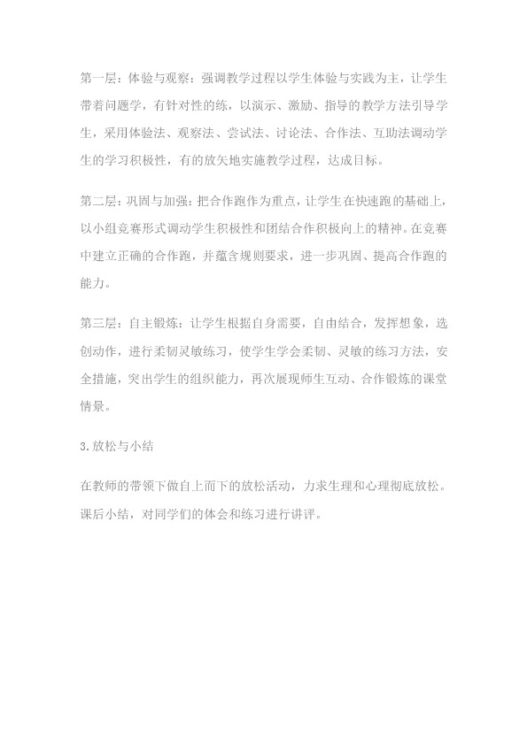 第二层:巩固与加强:把合作跑作为重点,让学生在快速跑的基础上,以小组竞赛形式调动学生积极性和团结合作积极向上的精神。在竞赛中建立正确的合作跑,并蕴含规则要求,进一步巩固、提高合作跑的能力。