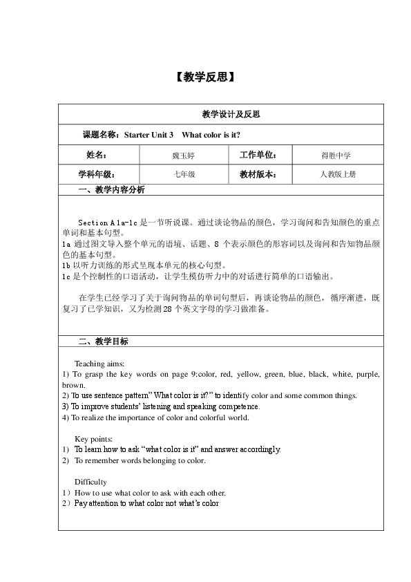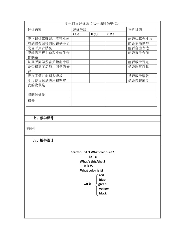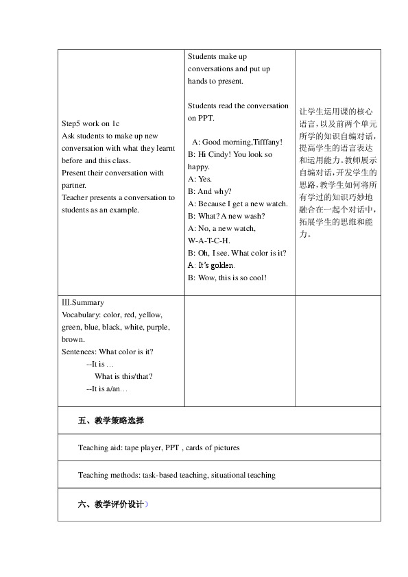 2) To use sentence pattern” What color is it?” to identify color and some common things.