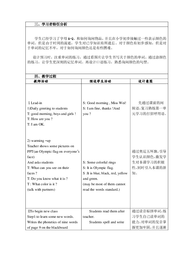 学生已经学习了字母A-Q,和如何询问物品,并且在小学初步接触过一些表示颜色的单某某。但是由于时间的流逝,学生对已学知识有所遗忘。对于颜色有初步感知,但是对于单某某的记忆不牢,对于如何询问颜色还是有些困难。