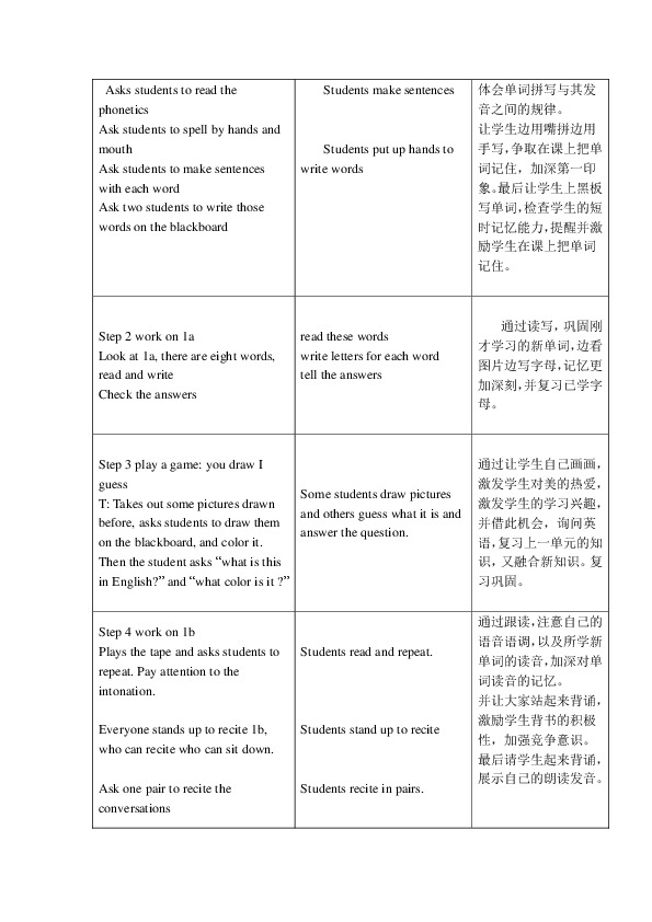 通过让学生自己画画,激发学生对美的热爱,激发学生的学习兴趣,并借此机会,询问英语,复习上一单元的知识,又融合新知识。复习巩固。